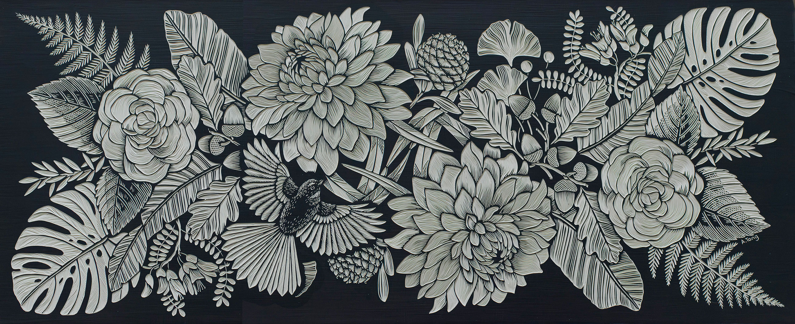 Anna’s artwork embodies a sense of beauty and peace, exploring arrangements of urban nature and wild flora. Her paint carvings are rich and intricate, with lines carefully carved into a thick base of layered acrylic paint, creating a beautiful handmade aesthetic, with the surface texture drawing viewers in to explore it from close up and at a distance. Anna’s professional background in graphic design informs her work: she prides herself on creating carefully considered and balanced pieces of art, with superb attention to detail and finely honed carving skills. She enjoys the simplicity of working in duotone and exploring the possibilities of what can be achieved with positive and negative space.