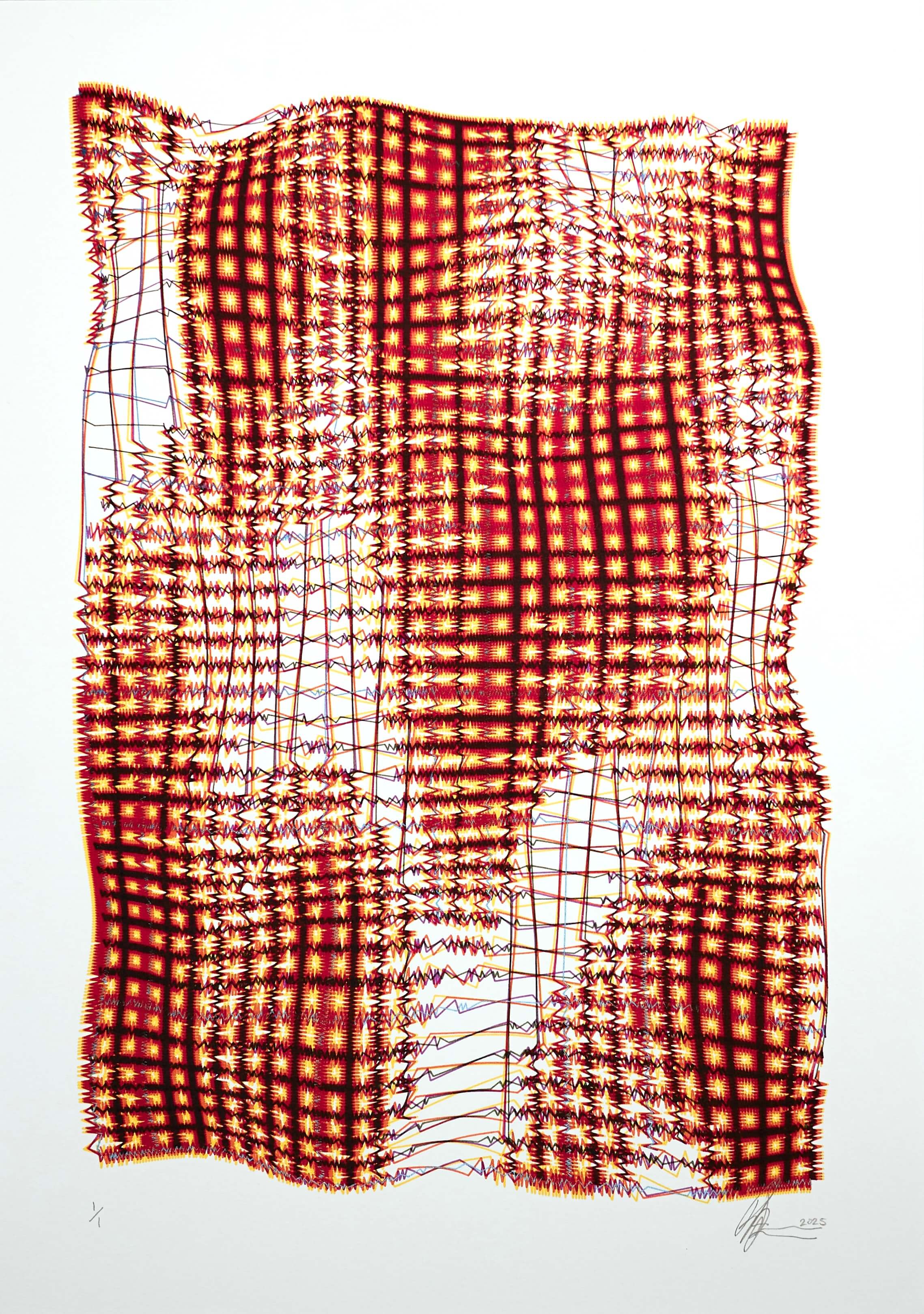 Reuben has a background in architecture, which inspires his art practice. Working primarily with pen and ink, Reuben creates highly technical and expressive artworks that weave intricate patterns and geometry into dynamic compositions. Reuben is drawn to the simplicity of line and to how proximity, density, repetition, and orientation allow complex, rhythmic patterns to emerge. Reuben’s architectural training has shaped his design approach to balance, restraint, and precision, which is reflected in a resolute attention to detail. Reuben employs a systematic method of making, incorporating algorithms and 3D modelling to generate iterative yet organic results. Influenced by both landscape and abstraction, Reuben’s work explores the tension between structure and emergence. The artworks are intended to be experienced at two scales: from a distance, where the overall composition comes into focus, and up close, where individual lines and geometries reveal their intricacy. This dual mode of viewing encourages slow looking and sustained engagement. Audience response has highlighted a strong connection to both the visual language of the work and the processes behind it. Alongside exhibitions, Reuben’s practice has reached a wide audience through social media, where interest in his methods—particularly the use of robotic technologies—reflects a growing fascination with new forms of creative expression.
