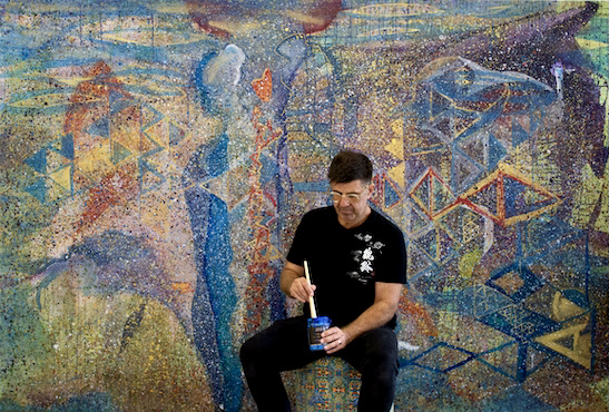 Richard’s signature style lays down dense topographical backdrops, bold, colourful and joyful, often on a grand scale. He describes his working method as one where each painting has been generated by the narratives of the one before it; in this way the works constitute something like the screengrabs of a constantly mutating, recombinant project. His work expresses how our currencies, which so often include the pop cultural material that we’ve all assimilated and loved in its various forms, are in some sense tribal and reach beyond mere product or commodity to become shared symbols, a lingua franca.