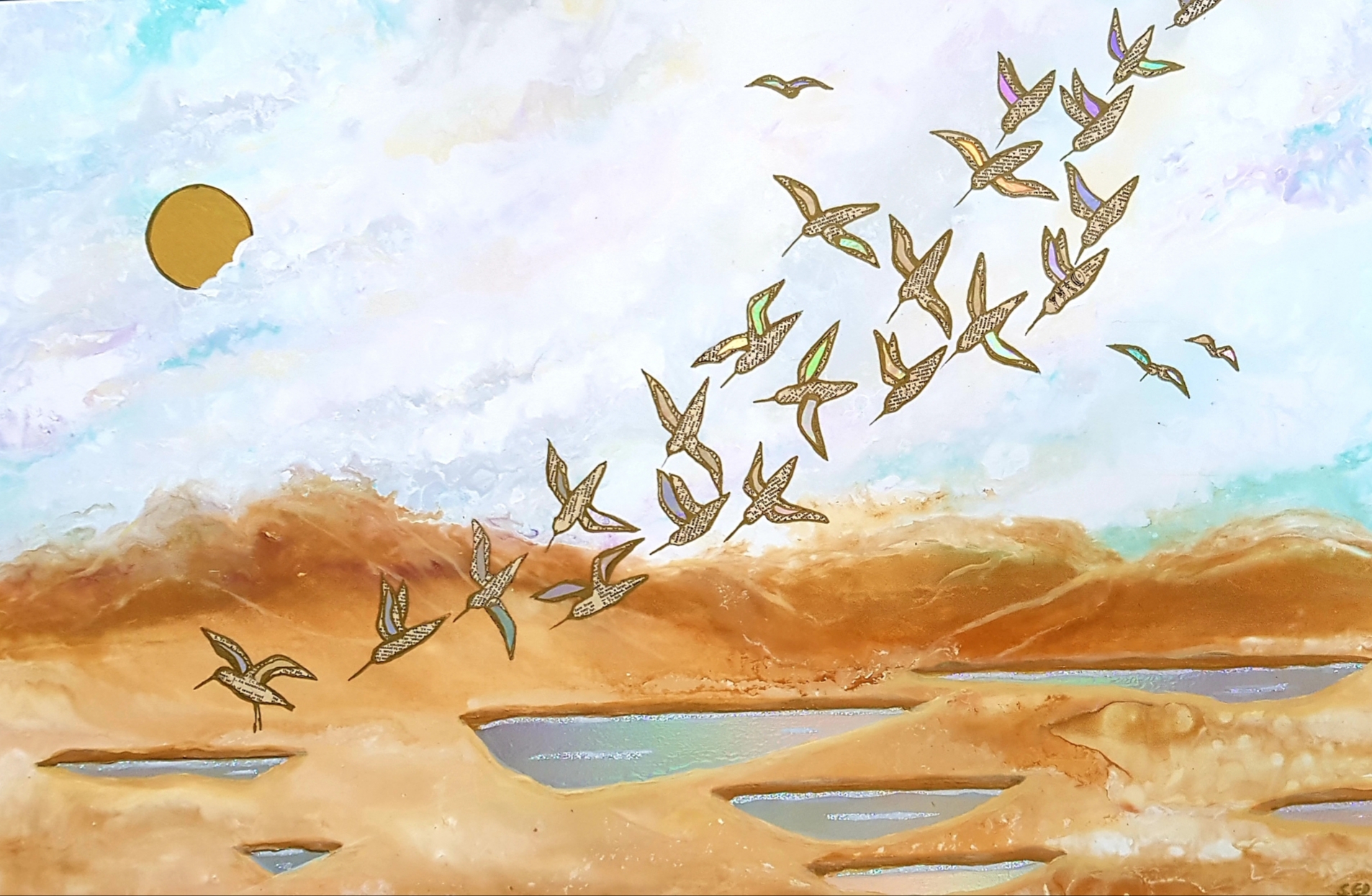 Susan works from her studio in Waipu , Northland. Her recent works celebrate a fluid landscape occupied by a small but significant life force. Susan works with mixed media to bring shimmer, light and changing perspective to the scene . She enjoys collage. Susan has had several solo exhibitions ,displayed work in group shows , and enjoys commissions.